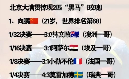 向鹏也是持外卡参与资格赛的男单选手,他从9月26日的资格赛开始打起,9月29日3-0淘汰澳洲一哥林文政,16强赛3-1淘汰埃及一哥阿萨尔,8强赛3-1淘汰小勒布伦(法国一哥),4强赛更是4-3淘汰莫雷加德(瑞典一哥+奥运男单亚军),可以说向鹏本次北京大满贯已经成为男单最大的黑马。