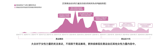 巴黎奥运会后,女性力量的表达仍在持续。大众目光持续聚焦于女性运动员表现出的顽强精神与性格魅力,并将关注与讨论拓展到赛场外更为广泛的女性话题上。女性角色在奥运多元场景下所形成的微博社交热点内容,凝聚为品牌可利用的女性力量心智共识,能够为品牌吸引扩容更多潜在用户资产。