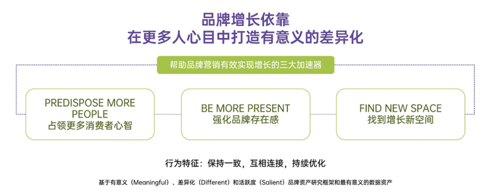 在凯度发布的《品牌增长蓝图》指导里,透过大量且长期的品牌数据,发现品牌增长的关键是全力在更多人心中打造品牌有意义的差异化。品牌需要做到:占领更多消费者心智,强化品牌存在感,和找到新的增长空间——进而实现品牌的有效增长。