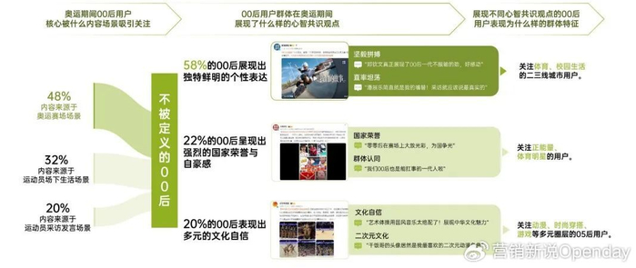 相较于东京奥运,巴黎奥运吸引了更多00后的目光并激发了他们深度互动,微博上的话题和内容也激发00后的社交情绪并凝结成了新的心智共识。00后被运动员的赛事表现和他们在采访和幕后花絮里自信又可爱的表现所吸引,用户在微博上的关注互动凝结成00后多元、不被定义的新共识。