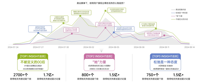 大众在竞技赛场等多元社交热点场景之下,自发关注本届奥运会中的运动员、裁判、教练等核心人物要素,积极参与讨论互动。微博社交热点氛围迅速激发用户社交情绪并引发情绪共鸣,催生出用户对于同一价值元素的多种解读,从而凝结为本白皮书提出的三大心智共识趋势,即:不被定义的00后、【“她”力量】和松弛是一种态度。