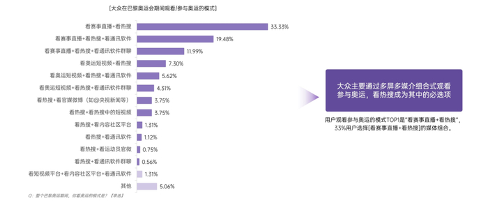 大众关注本届奥运会的行为形态也发生了变化,大众更多采用多屏多媒介的组合模式消费奥运会内容,其中“看热搜”成为大众观赛的必选项;同时大众在本届奥运会期间,更多参与到社媒平台关于奥运会的讨论互动中,微博贡献了其中半数以上相关内容。在大众的观赛体验以及在社交媒体的互动中,可以洞悉大众对奥运讨论焦点从赛事输赢转向了具体的人物及其价值共识讨论,进而引发深层次的社交情绪释放和反馈。
