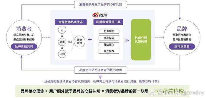 在微博社交热点场域中,品牌可以将自身品牌核心理念置于微博社交热点生态之下,借助微博科学的社交热点营销工具进行有效传播。通过把握消费者心智共识趋势,在微博实现与消费者的持续沟通,才能够建立起消费者对品牌的“第一联想”,即品牌核心理念 + 用户额外赋予品牌的心智共识,实现品牌价值有效溢出。