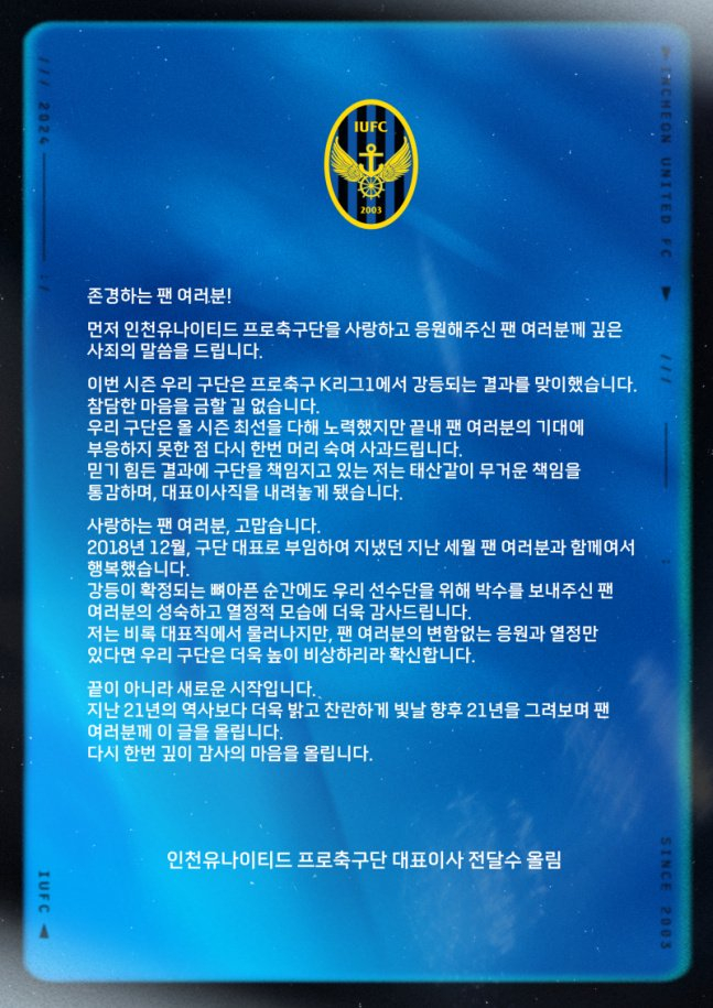 11月12日下午,田达秀委托俱乐部发布了公开声明,声明指出自己因为球队降级,深感痛心,因此主动担责,辞去俱乐部理事一职。但他希望球迷们不要放弃球队,继续给予足够的支持。表示“希望未来的21年历史,比过去的21年更加灿烂辉煌”。田达秀以这样的方式,正式和仁川球迷说再见。至此,6年的田达秀时代就此画上句号。