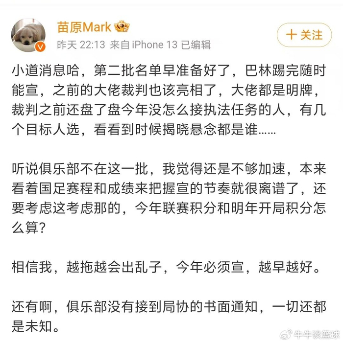 而第二批除了此前被曝光的多名涉及的现役国脚,名记苗原也爆料出了球迷最关注的裁判大鱼,苗原表示:“之前的大佬裁判也该亮相了,大佬都是名牌,裁判之前还盘了盘今年没怎么接到吹罚任务的人,有几个目标人选,看看到时候揭晓都有谁。”