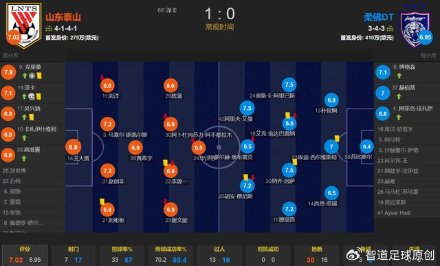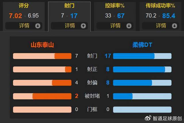 再看比赛数据,这是神奇的一战,也是伟大的胜利。山东泰山的控球率仅为33%,一共有7次射门,但仅有1次射正,就打入全场唯一的进球;柔佛新山一共有17次射门,其中8次射正。