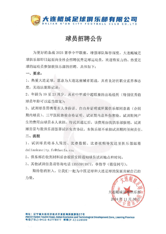 球员招聘公告具体为,为更好的备战2025赛季中甲联赛,增强球队阵容深度,大连鲲城足球俱乐部即日起面向全社会招聘优秀足球运动员,欢迎有实力的、热爱足球的运动员参加我俱乐部的招聘。球队的主要要求是热爱大连足球、有中甲或中超经历的年轻球员,同时对于试训的要求进行了规定,具体内容见下图。