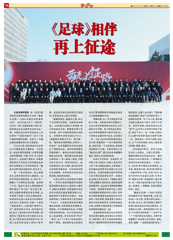 这种姿态和努力,所有人在这次会议上的表达,让我们决定用一整期的报纸来记录这次会议。我们相信这会是中国足球一个值得铭记的时间刻度和新的起点,只是这一次,《足球》报不再仅仅是观察者、记录者,更是参与者,当《足球》将所有人召集到西安,开会、交流、研讨,当我们和所有与会嘉宾站到18米长的“重走长征路”巨幅海报下面合影时,这一刻的《足球》报已经不仅仅是一张报纸、一家媒体,而是中国足球的一部分。