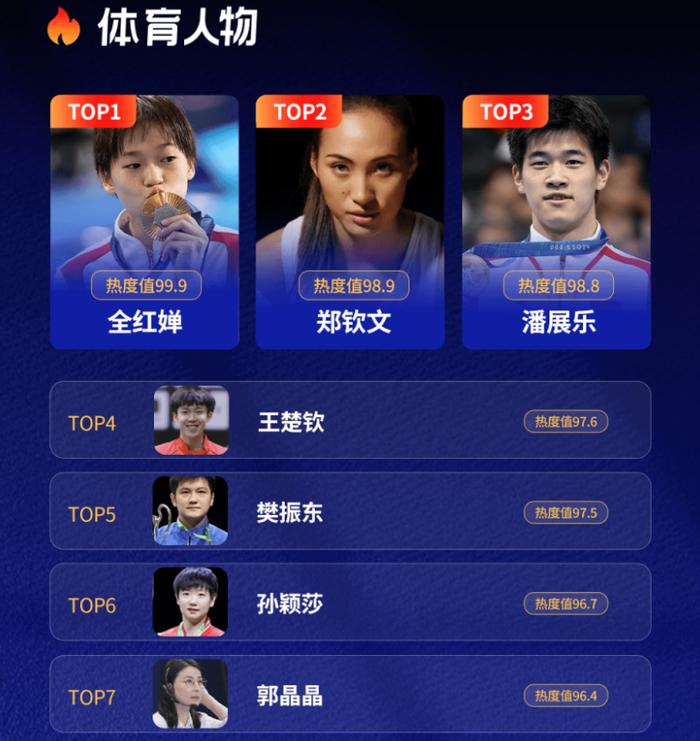 克劳锐发布《热搜年度报告》显示,这一年网络用户关注的体育人物,第一名属于中国跳水冠军运动员全红婵,她的热度值高达99.9,同时在年度最受网络用户关注的热点人物,全红婵排名第三,仅次于特朗普和普京。