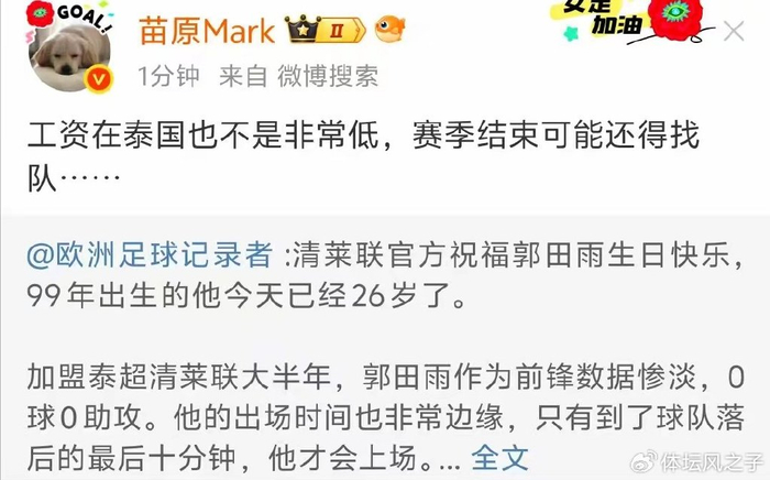 就在近日,对于效力泰超联赛清莱联队的中国球员郭田雨来说,这一天有着特殊的意义——他迎来了自己26岁的生日,为此清莱联官方还特意发布了一段为郭田雨庆生的视频,从视频中可以看到郭田雨还是非常开心的,并且他与队友之间的互动也是展现出了他已经融入到了球队中的良好氛围,只是郭田雨在场上的表现却完全没有达到预期。