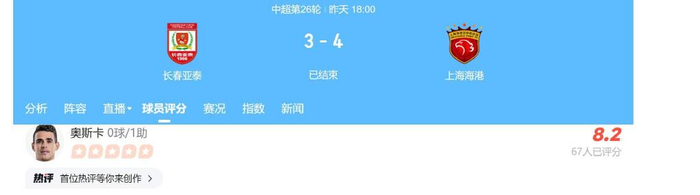 中超第26轮,上港奥斯卡状态神勇,在赛后球员评分环节上,他是被评为8。2分,本场比赛上港4比3战胜长春亚泰,其中有一个球就是他助攻给古斯塔沃进球的。在赛后奥斯卡一直遵循传统,每赢一场球都会发文庆祝,这次他写到:“关键的客场3分,太不容易。这比赛也是球队取胜心和凝聚力的最好体现。
