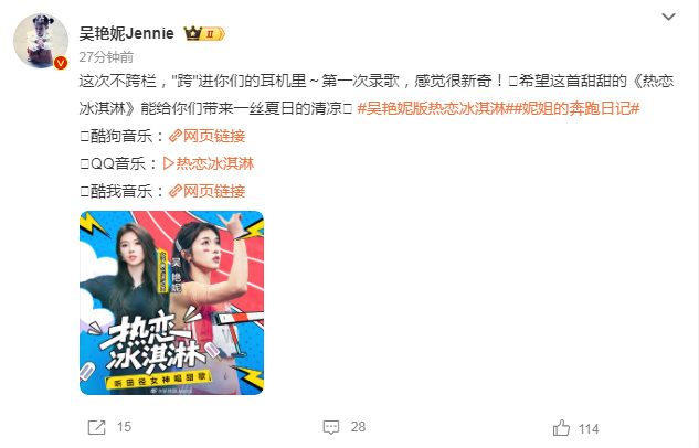 吴艳妮通过社媒写道:“这次不跨栏,‘跨’进你们的耳机里~第一次录歌,感觉很新奇!希望这首甜甜的《热恋冰淇淋》,能给你们带来一丝夏日的清凉。”