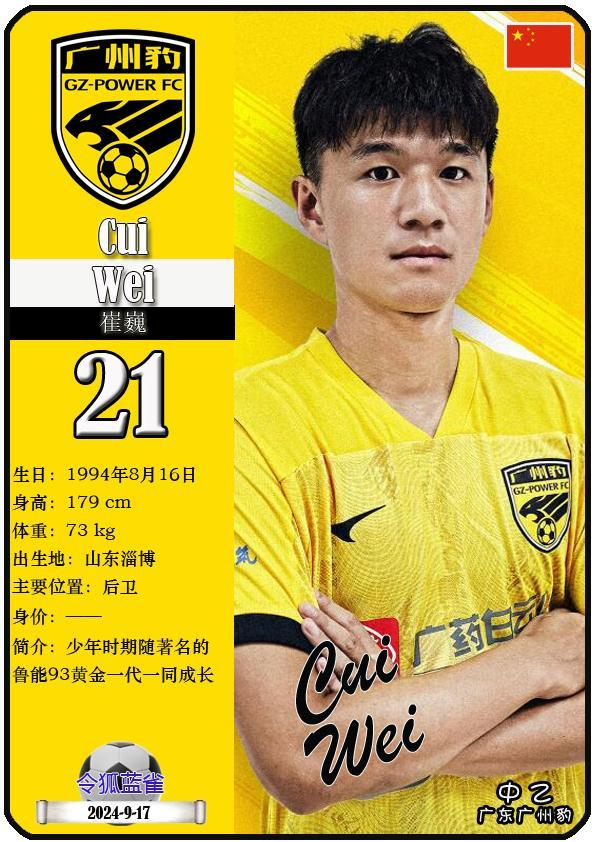 21 崔巍:司职后卫,国籍为中国,现效力于中乙-广东广州豹足球俱乐部。