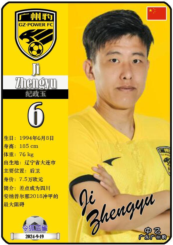 6 纪政玉:司职后卫,国籍为中国,现效力于中乙-广东广州豹足球俱乐部。