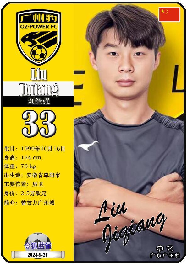 33 刘继强:司职后卫,国籍为中国,现效力于中乙-广东广州豹足球俱乐部。
