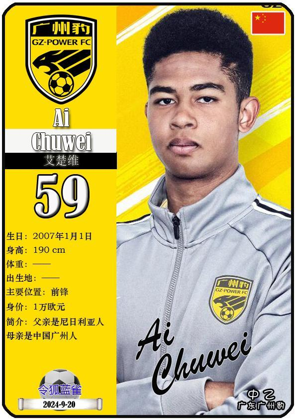 59 艾楚维:司职前锋,国籍为中国,现效力于中乙-广东广州豹足球俱乐部。