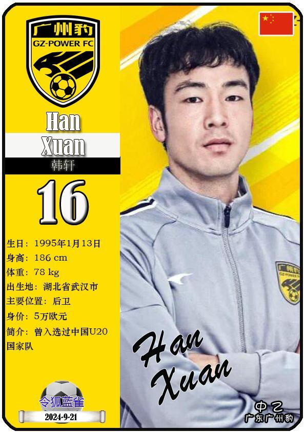 16 韩轩:司职后卫,国籍为中国,现效力于中乙-广东广州豹足球俱乐部。