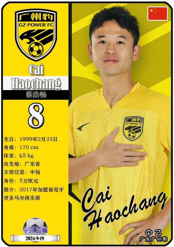 8 蔡浩畅:司职中场,国籍为中国,现效力于中乙-广东广州豹足球俱乐部。