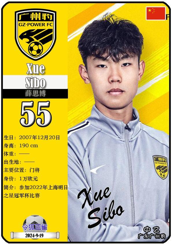 55 薛思博:司职门将,国籍为中国,现效力于中乙-广东广州豹足球俱乐部。