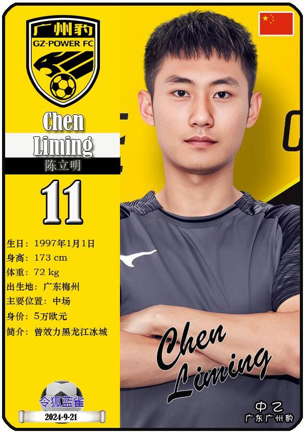 11 陈立明:司职中场,国籍为中国,现效力于中乙-广东广州豹足球俱乐部。