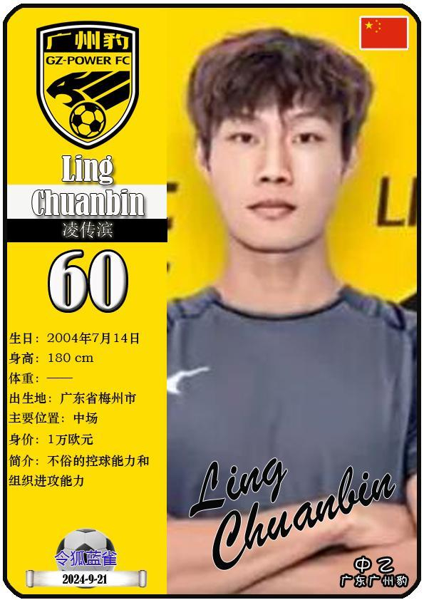 60 凌传滨:司职中场,国籍为中国,现效力于中乙-广东广州豹足球俱乐部。