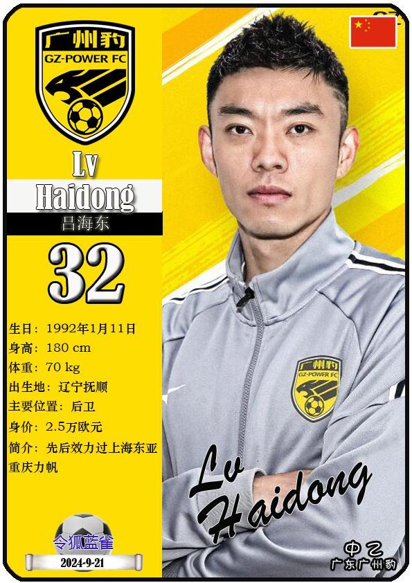 32 吕海东:司职后卫,国籍为中国,现效力于中乙-广东广州豹足球俱乐部。