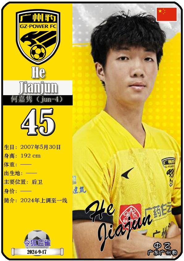 45 何嘉隽(jun-4):司职后卫,国籍为中国,现效力于中乙-广东广州豹足球俱乐部。