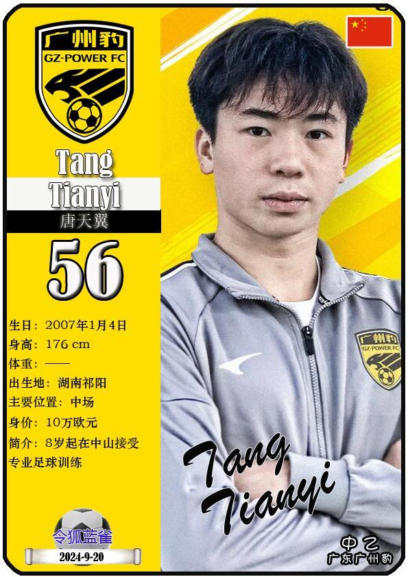 56 唐天翼:司职中场,国籍为中国,现效力于中乙-广东广州豹足球俱乐部。