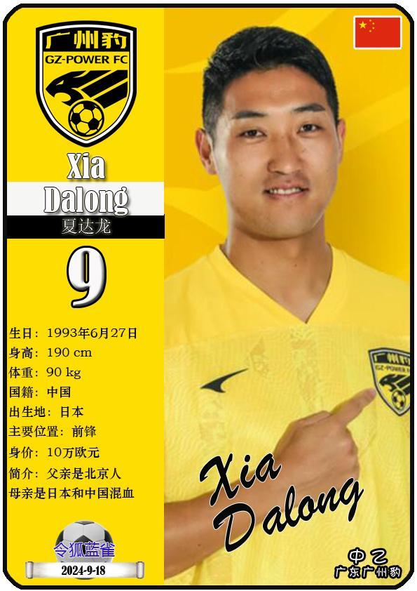 9 夏达龙:司职前锋,国籍为中国,现效力于中乙-广东广州豹足球俱乐部。