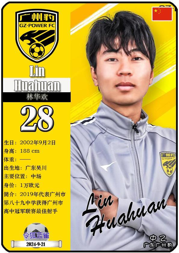 28 林华欢:司职中场,国籍为中国,现效力于中乙-广东广州豹足球俱乐部。
