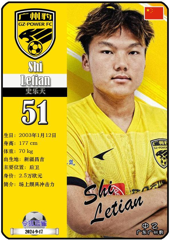 51 史乐天:司职后卫,国籍为中国,现效力于中乙-广东广州豹足球俱乐部。