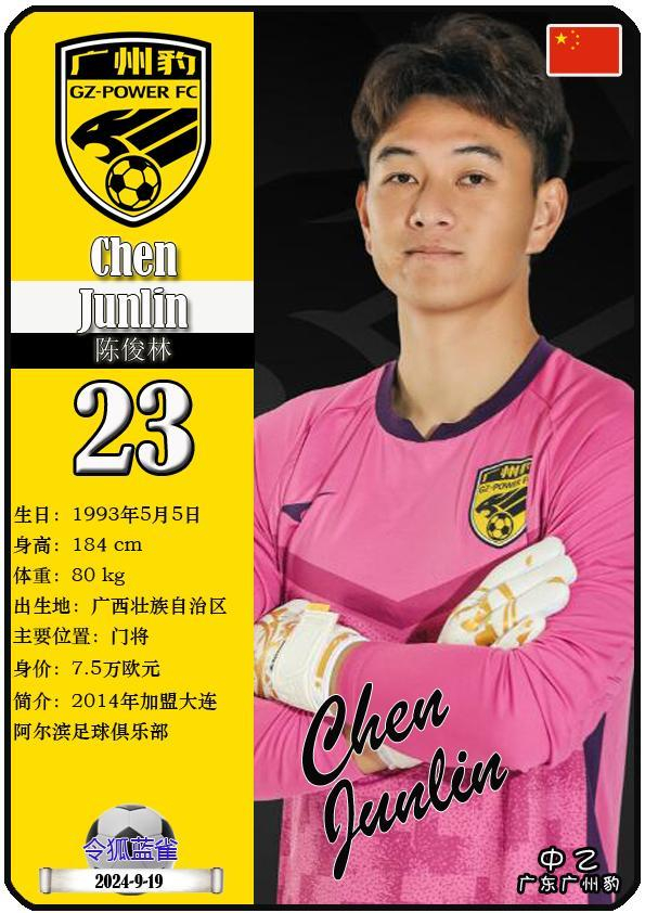 23 陈俊林:司职门将,国籍为中国,现效力于中乙-广东广州豹足球俱乐部。