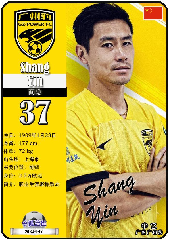 37 商隐:司职前锋,国籍为中国,现效力于中乙-广东广州豹足球俱乐部。