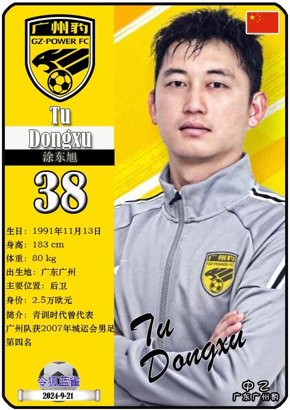 38 涂东旭:司职中场,国籍为中国,现效力于中乙-广东广州豹足球俱乐部。