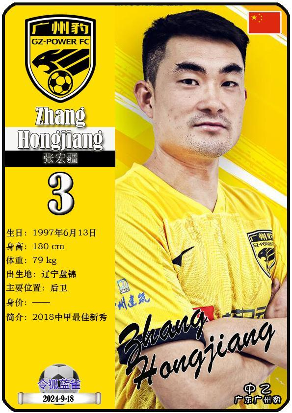 3 张宏疆:司职后卫,国籍为中国,现效力于中乙-广东广州豹足球俱乐部。