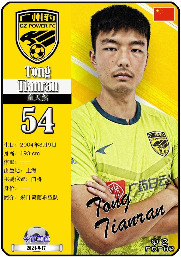 54 童天然:司职门将,国籍为中国,现效力于中乙-广东广州豹足球俱乐部。