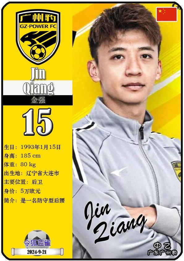 15 金强:司职后卫,国籍为中国,现效力于中乙-广东广州豹足球俱乐部。