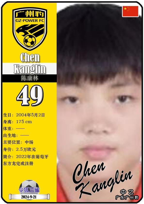 49 陈康林:司职中场,国籍为中国,现效力于中乙-广东广州豹足球俱乐部。