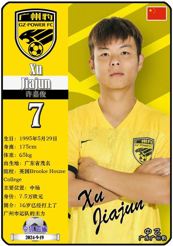 7 许嘉俊:司职中场,国籍为中国,现效力于中乙-广东广州豹足球俱乐部。