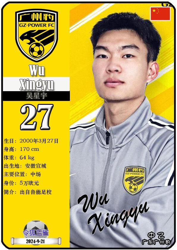 27 吴星宇:司职中场,国籍为中国,现效力于中乙-广东广州豹足球俱乐部。