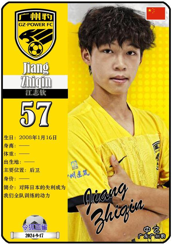 57 江志钦:司职后卫,国籍为中国,现效力于中乙-广东广州豹足球俱乐部。