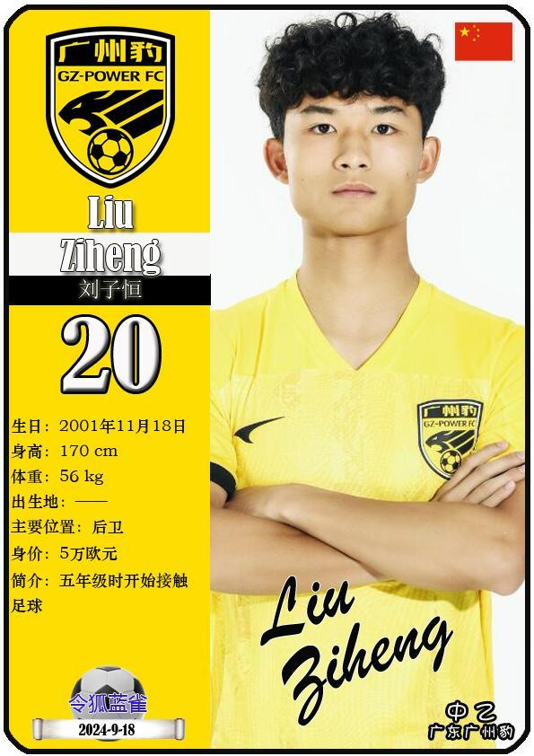 20 刘子恒:司职后卫,国籍为中国,现效力于中乙-广东广州豹足球俱乐部。