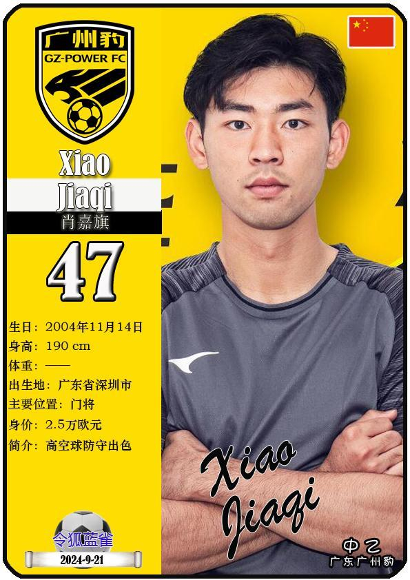 47 肖嘉旗:司职门将,国籍为中国,现效力于中乙-广东广州豹足球俱乐部。