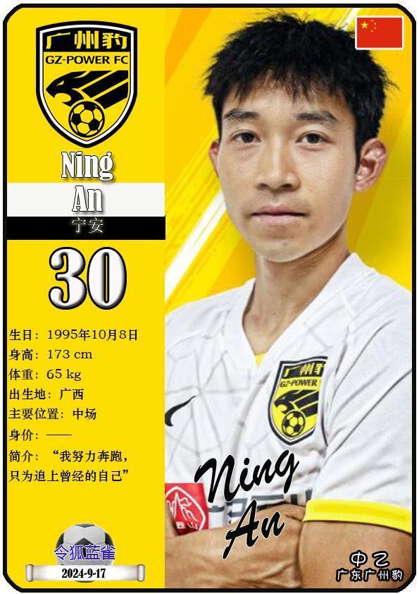30 宁安:司职中场,国籍为中国,现效力于中乙-广东广州豹足球俱乐部。