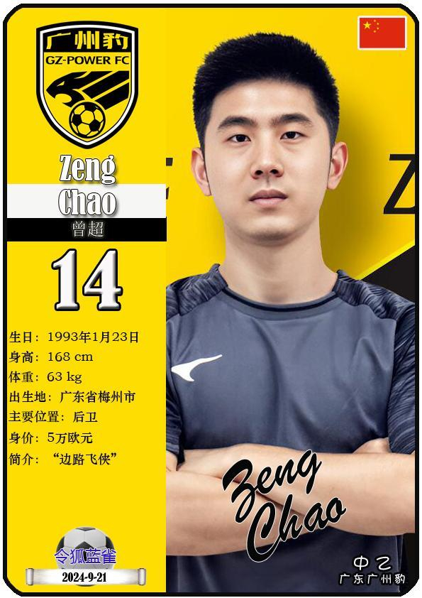14 曾超:司职后卫,国籍为中国,现效力于中乙-广东广州豹足球俱乐部。