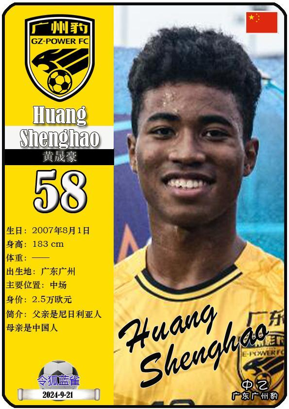 58 黄晟豪:司职中场,国籍为中国,现效力于中乙-广东广州豹足球俱乐部。