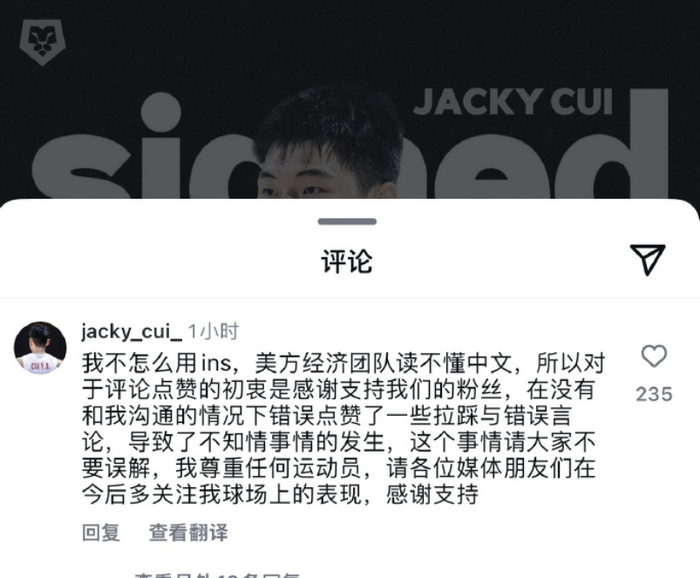 美国经纪人团队都是美国人,不懂中文,看见有中文,自己就觉得肯定是过来给他加油的,就是来鼓励他的,因此他们就选择了就是把所有的这个中文评论都点上了一个赞,但他们不知道这是什么意思。