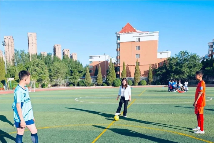 开幕式最激动人心的时刻莫过于开球仪式,高威校长一直高度重视和支持学校体育工作,特别是校园足球的发展。她走到开球点,勉励队员们尽情享受比赛,展现风采。随着裁判员一声示意,高校长将象征着激情、梦想与竞技精神的足球稳稳开出!足球在空中划出一道优美的弧线,瞬间点燃了全场师生的热情,雷鸣般的掌声和欢呼声响彻云霄!这充满力量的一脚,不仅宣告了本届“校长杯”足球赛的正式开赛,更传递了学校领导对体育育人、促进学生全面发展的坚定信念与殷切期望!