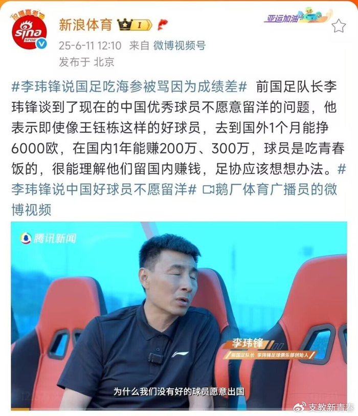 通过社交媒体,李玮锋表示:吃海参不是国足的错,是成绩差,因此,吃海参被骂。
