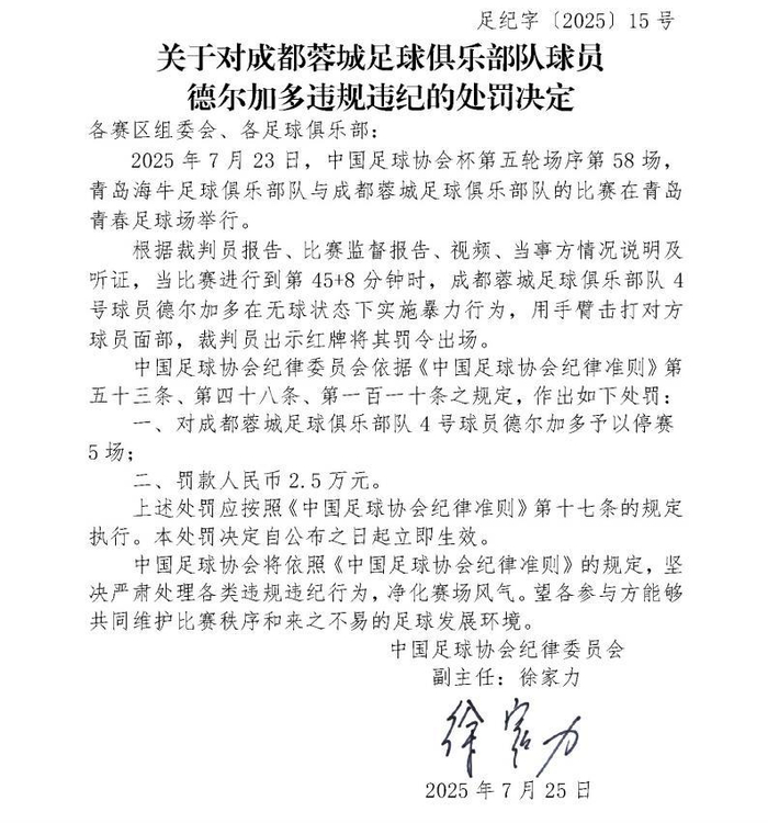 北京时间7月25日,中国足协宣布成都蓉城球员德尔加多的罚单。在足协杯对阵青岛海牛的比赛中,德尔加多击打孙正傲被罚下,中国足协对他追加处罚5场,罚款25000。